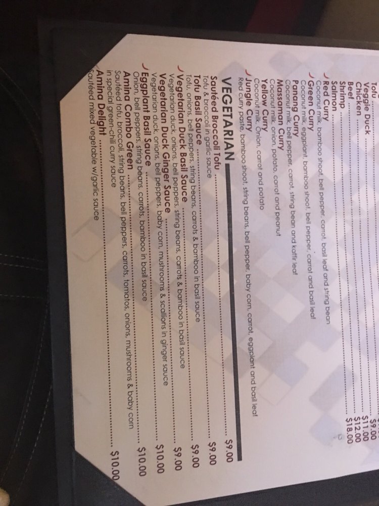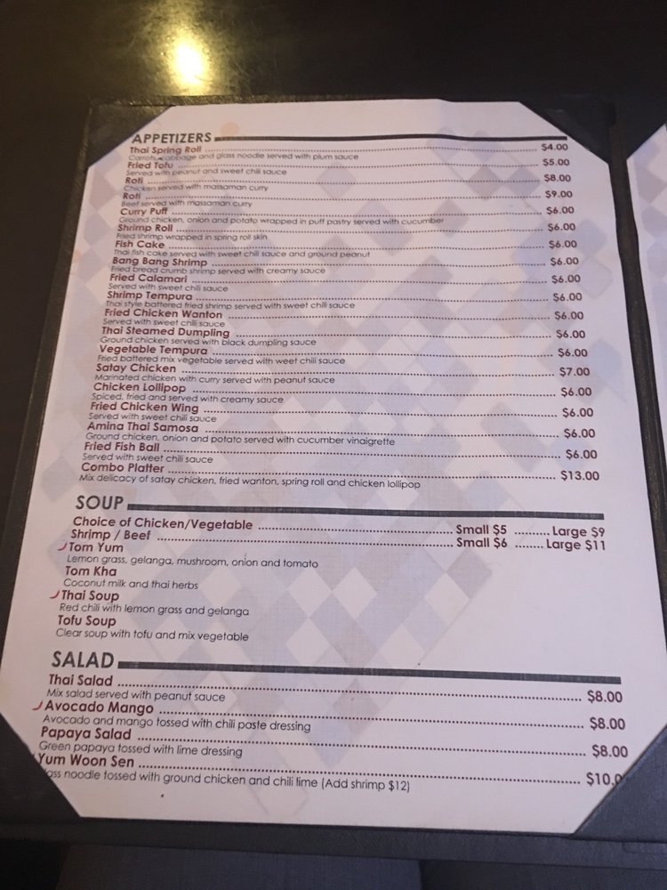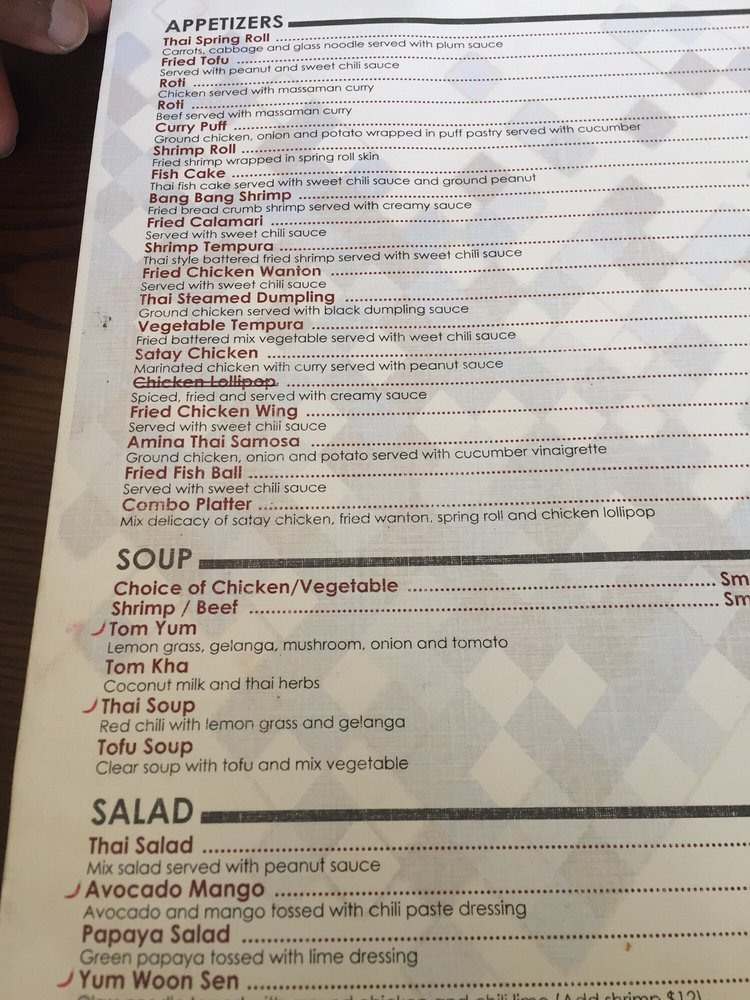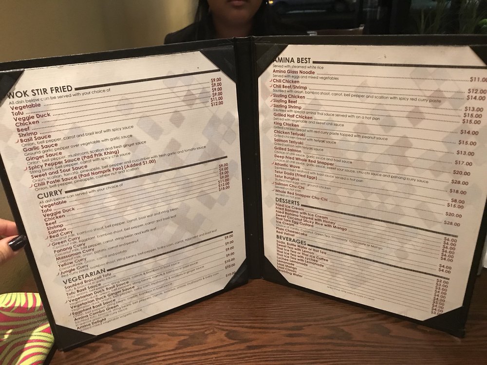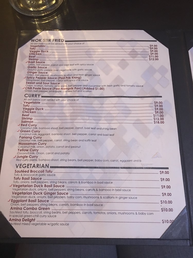 Introducing the menu at Amina Thai, a halal Thai restaurant in Jamaica, NY, offering a variety of appetizers, soups, and salads. The menu includes favorites like Thai Spring Rolls, Tofu with peanut sauce, Tom Yum Soup, and Papaya Salad. Customers rave about the quality of the food, comparing it to authentic Thai restaurants in the city. The environment is praised for being tasteful and filling, with highlights such as Thai Iced Tea, Lollipop Chicken, and Coconut Sticky Rice with Mango. Despite some mixed reviews regarding cash-only policy and slow service, Amina Thai is commended for its close-to-authentic taste and welcoming Muslim family-owned atmosphere. With its many vegetarian options and cozy ambiance, Amina Thai is a must-visit spot for delicious Thai cuisine.